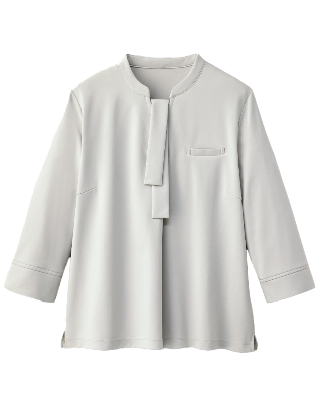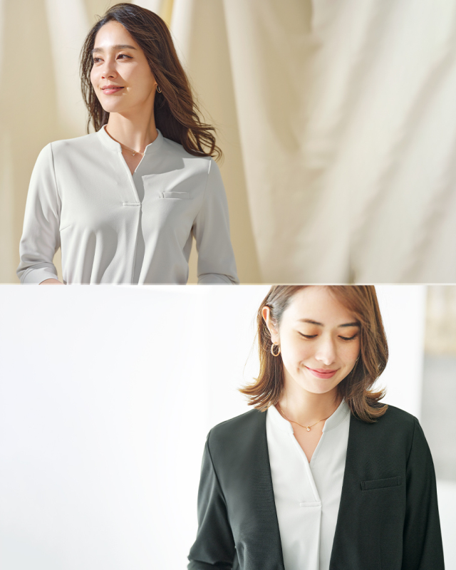 ボウタイリボンは取り外し可能な2WAY仕様。リボンを外すと首元はキーネックデザインでシャープな印象に早変わり。内側にはインナーチラ見え防止用の隠しボタンを付けました。