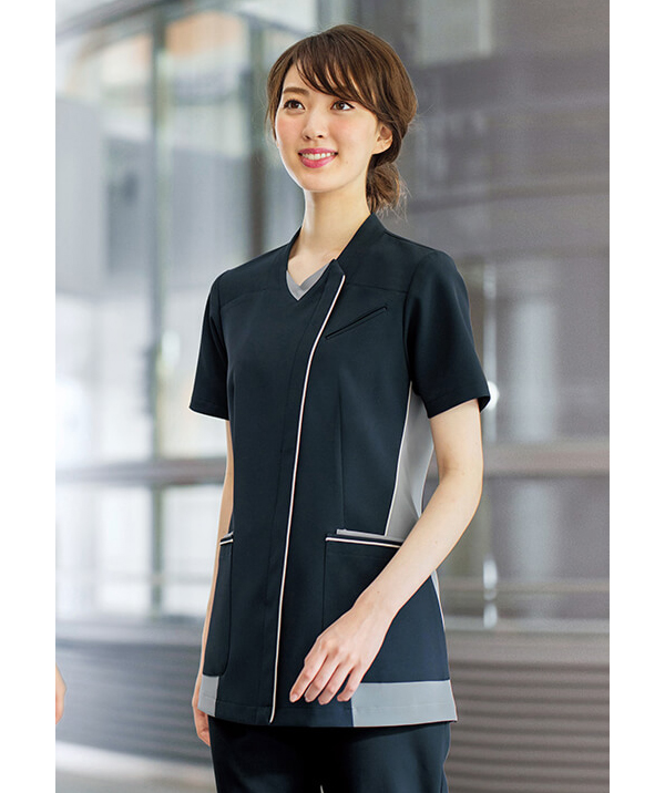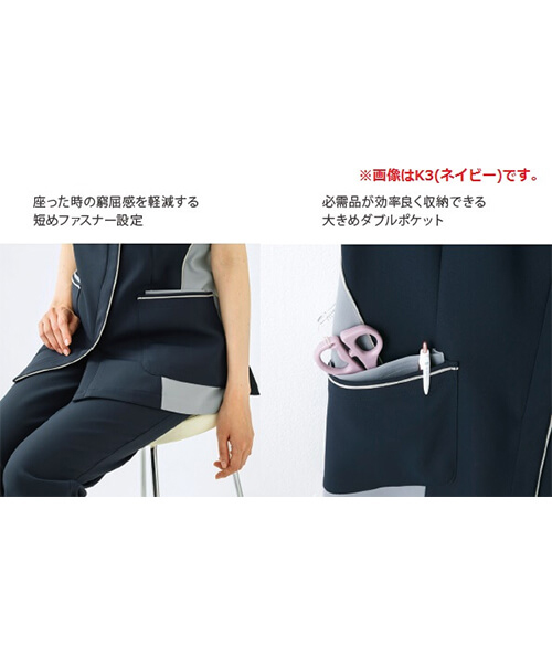 Topジャケット 【会員専用】 アクセントカラーで痩せ見え!腰ポケット付き浅めブイネックジャケット 通常販売価格: ¥9,350(税込) 価格: ¥5,000 (税込) 46%OFF 販売期間: 数量: 点 サイズ在庫購入S98点 M153点 L58点 LL61点 3L62点 サイズ在庫購入S98点 M153点 L58点 LL61点 3L62点 返品についての詳細はこちら 直線的なラインがすっきり知的に見える女性用ジャケット。かがんでもチラ見えしにくいVネックの配色がポイント。前開きはスナップ&ファスナー、後衿付け部分にストラップがずれにくいタブ付き、左胸・両腰・右後にポケット、さらにウエストループが付いています。腰ポケットはたっぷり収納で、小物を分別しやすい2重構造。後ろ裾にはサイドベンツが入っていて動きやすく、ヒップのサイズカバーもします。ネイビー・ワインの2色展開です。 制菌、制電、吸汗速乾性、ストレッチ性に優れ、透けにくくソフトな手触りの素材です。