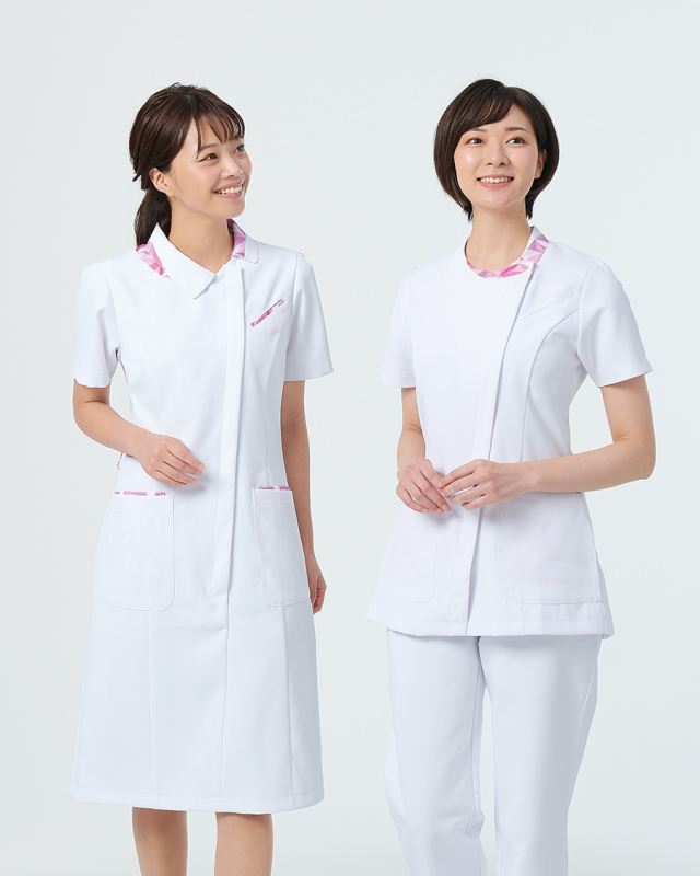 首元をすっきりきれいに見せる効果のUネックラインの女性用ジャケット。前開きはファスナーで上端にはスナップが付いています。後ろ袖はラグランスリーブになっていているので肩と腕を動かしやすいです。後衿付け部分にはストラップがずれにくいタブ付き、左胸・両腰にはポケットが付いています。腰ポケットはマチ付きでたっぷり収納できる上、小物を分別しやすい2重構造。ウエストには柄生地のループが付いています。後ろ裾にはサイドベンツを入れてヒップサイズをカバーしながら、動いた時に見える部分に柄生地を使いデザインポイントに。ピンク・ブルー・ベージュの3色展開です。