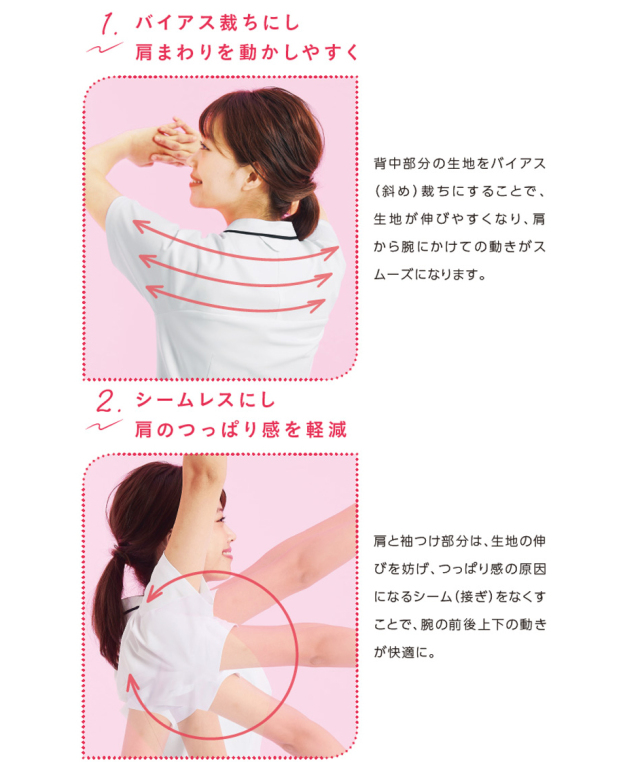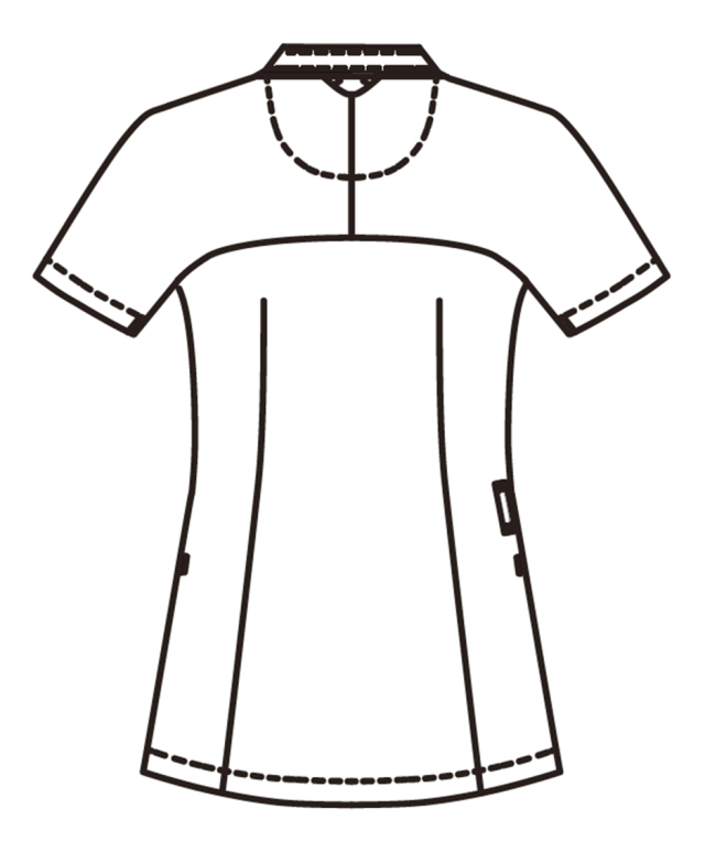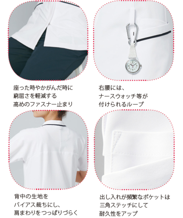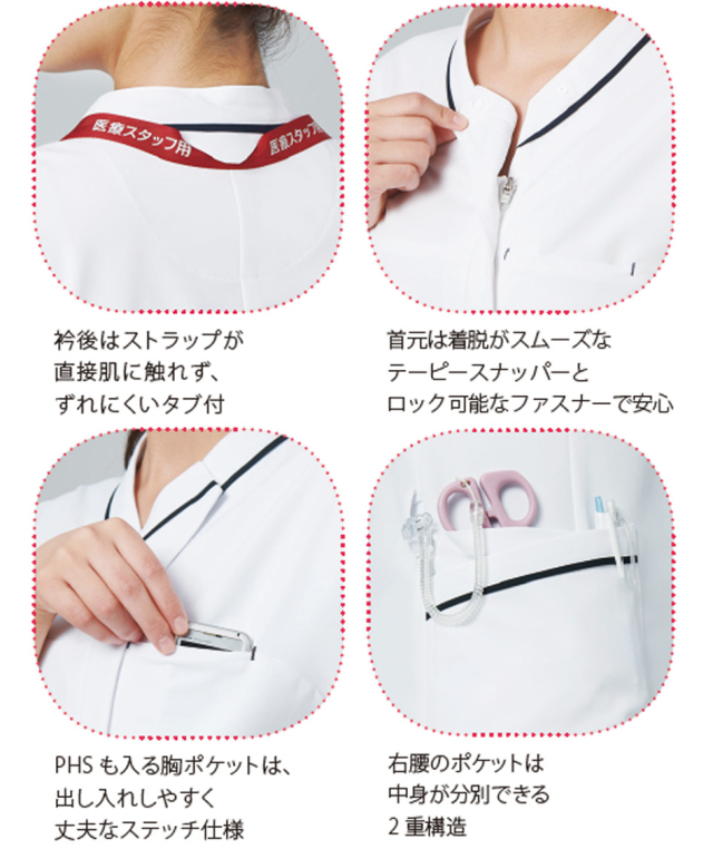 体を動かすことの多いナースのために、信州大学と共同開発した女性用ジャケット。襟付け、ポケットには配色のラインが入っていてアクセントになっています。腕・肩をスムーズに動きやすくするため、背中部分の生地をバイアス(斜め)にし、肩と袖の縫い目をなくしたパターンです。かがんでもチラ見えしにくい浅めのVネックや後衿付け部分にストラップがずれにくいタブを付ける工夫をしています。前開きはファスナー(ロック可能)で上端はテーピースナッパーを付けています。左胸・両腰にポケット付き、腰ポケットはたっぷり収納で、小物を分別しやすい2重構造(右側のみ)になっています。右ウエストにはループが付いています。