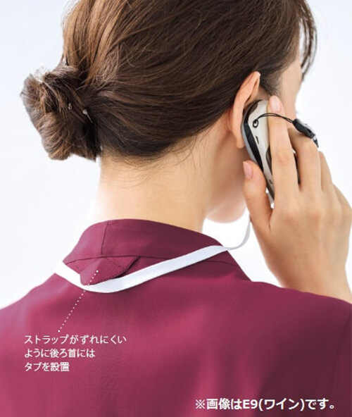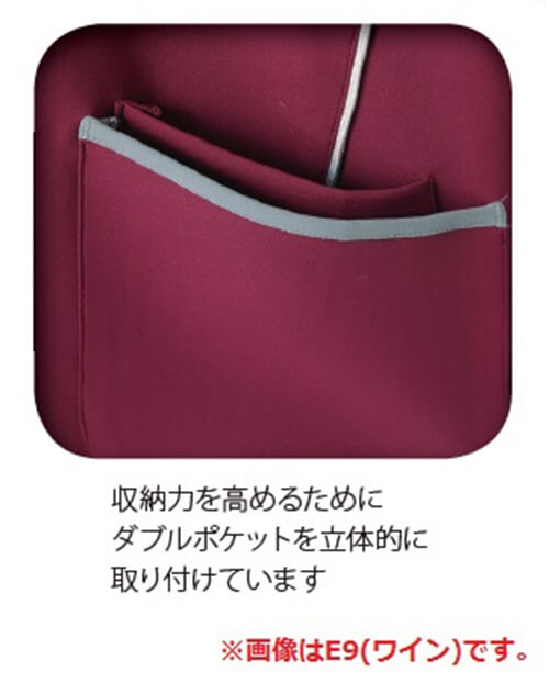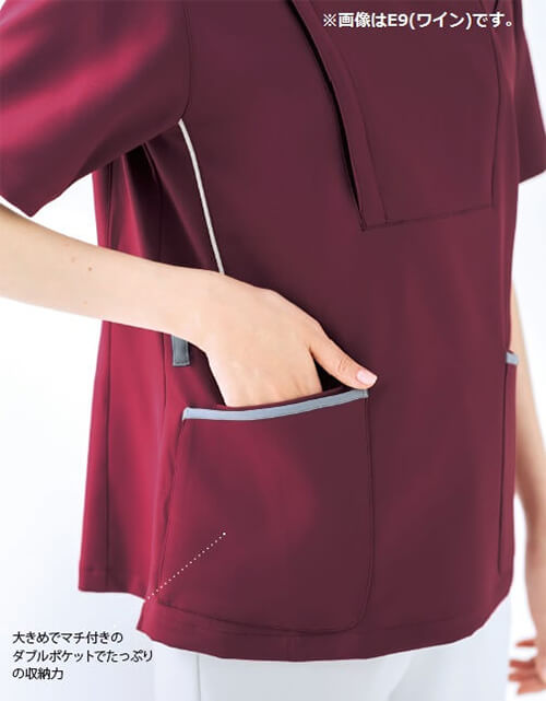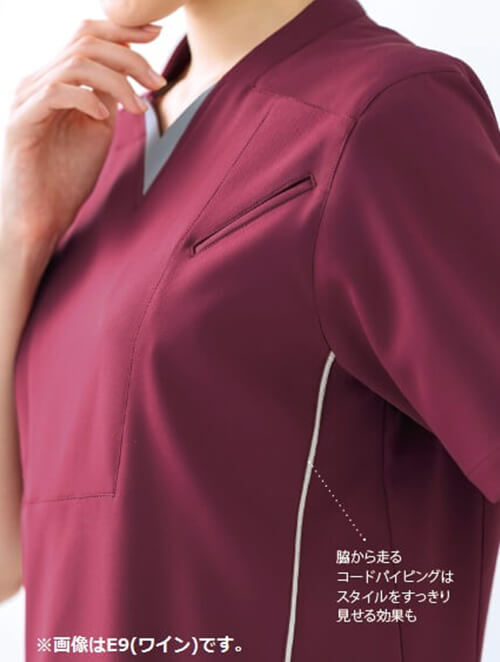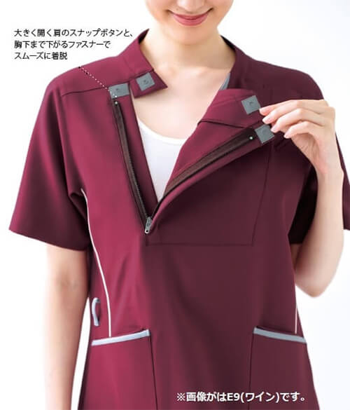 着脱がラクなのにすっきり見えるデザインスクラブ。かがんでもチラ見えしにくいVネックの配色がポイントです。大きく開く肩のスナップボタンと胸下までのファスナーで着脱がスムーズ。後衿付け部分にストラップがずれにくいタブ付き、左胸と両腰にポケット、さらにウエストループが付いています。腰ポケットはたっぷり収納で、小物を分別しやすい2重構造。ネイビー・ワイン・ブルー・グリーンの4色展開です。